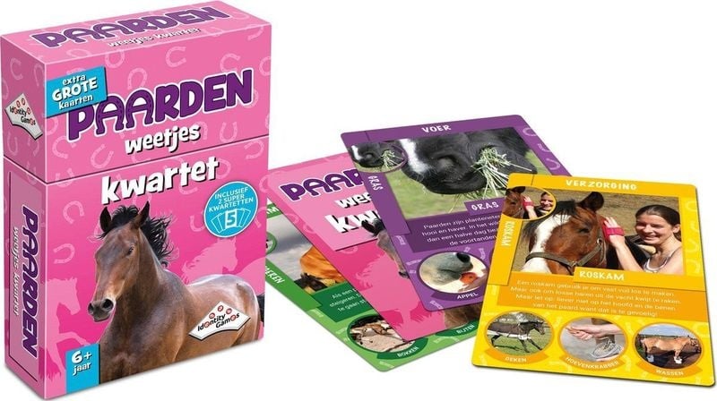Speel het oer-Hollandse kaartspel Kwartet met prachtige paarden in Kwartet Paarden! In dit klassieke spel probeer je steeds vier kaarten van dezelfde set te verzamelen. Deze speciale editie draait helemaal om paarden en is uitgevoerd met extra grote kaarten met mooie foto’s en leuke weetjes. Verzamel de meeste kwartetten en win het spel!