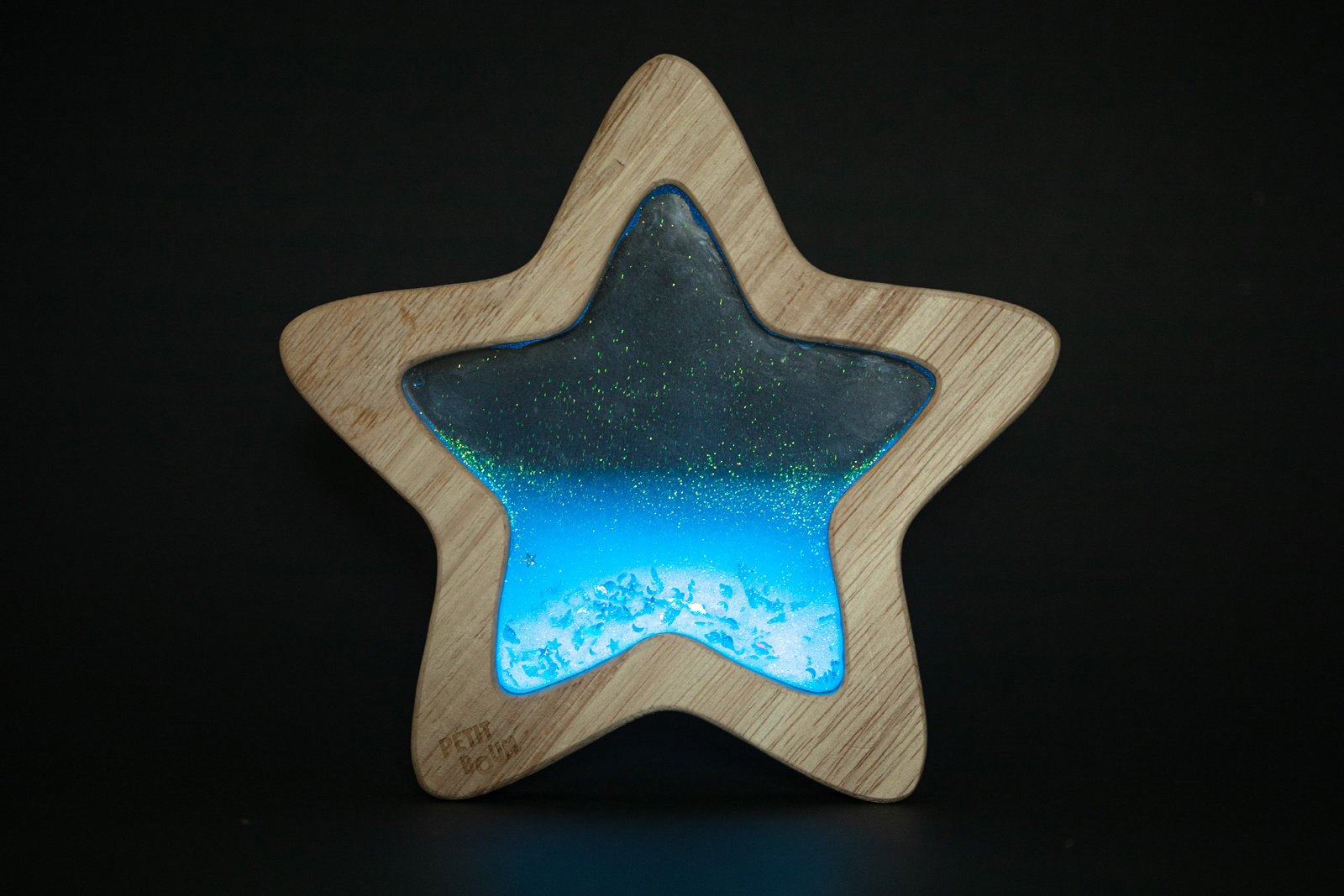 Beukenhouten frame gevuld met kleurrijke, fluorescerende vloeistoffen en glitters. Helemaal veilig.